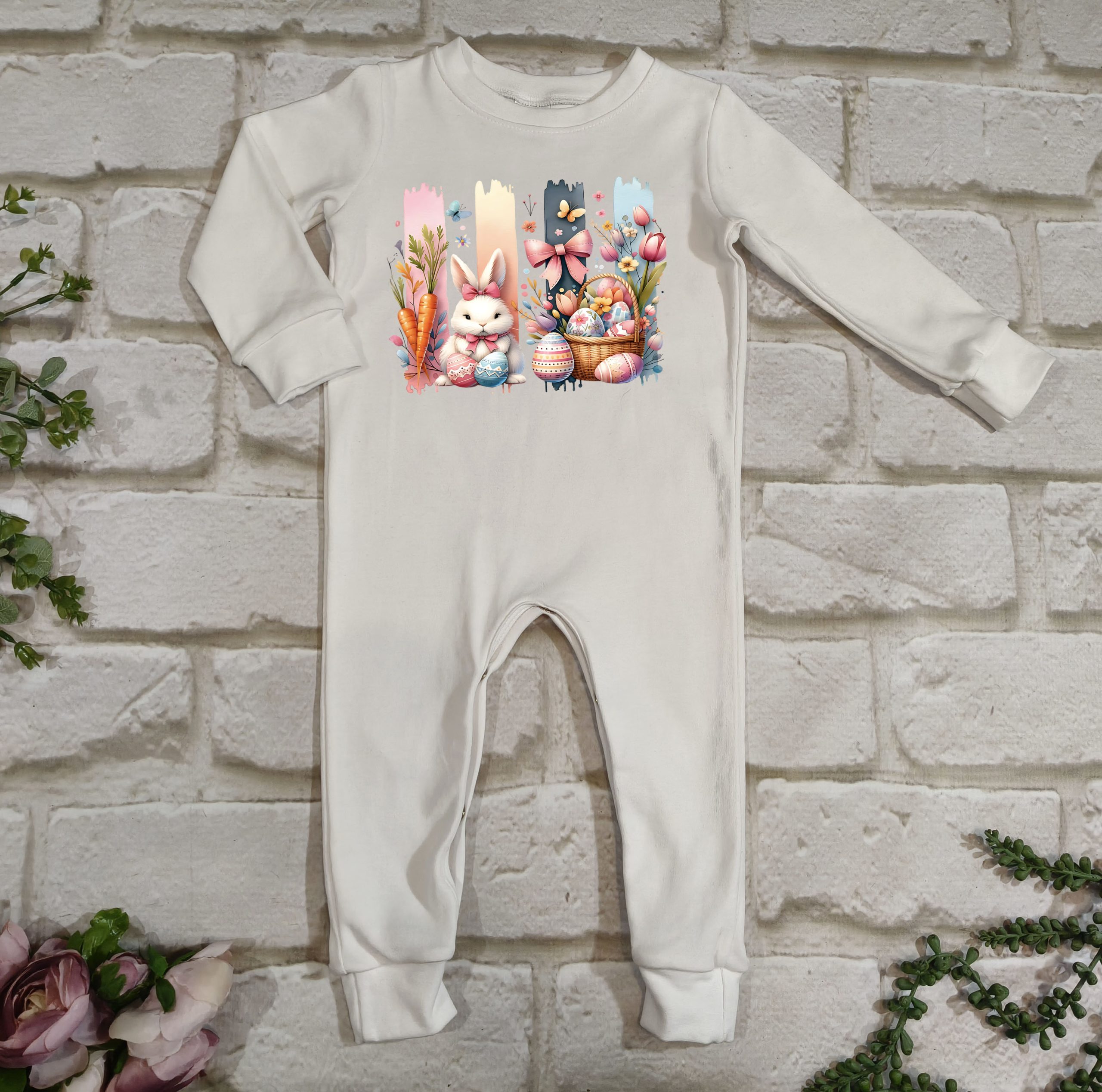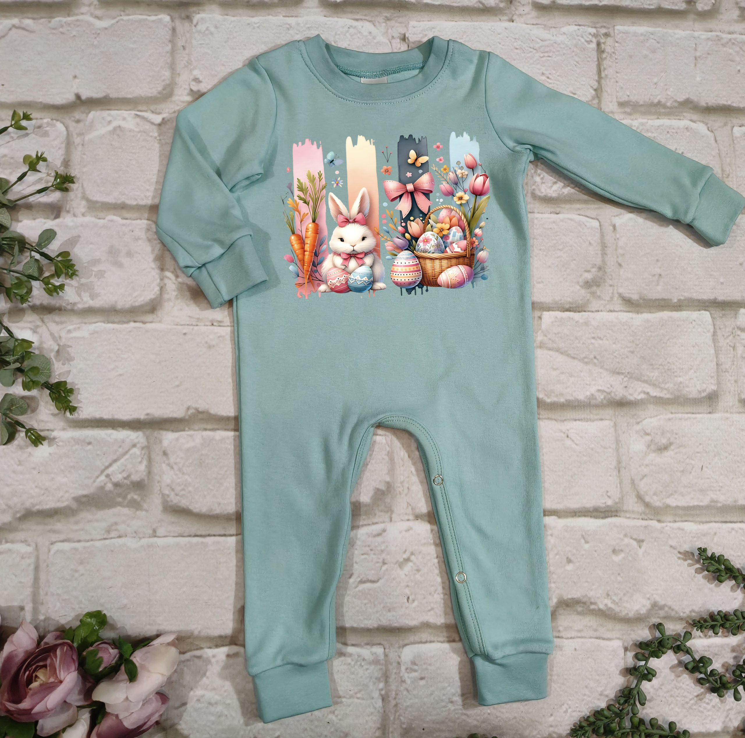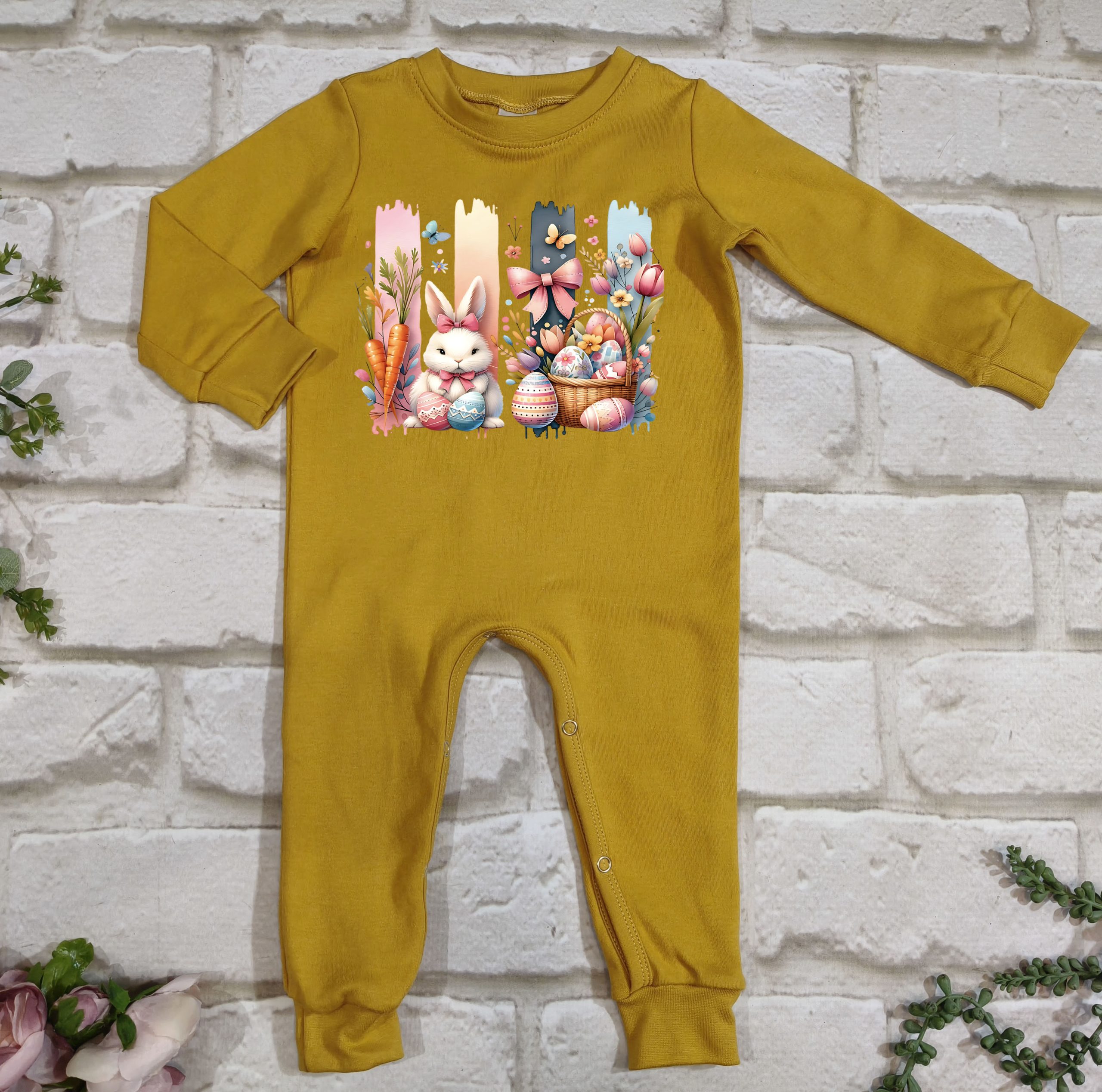 Hierdie oulike Paasfees tema long romper is gemaak van 100% katoen, wat dit sag, asemhaalbaar en gemaklik maak vir jou baba se sensitiewe vel.