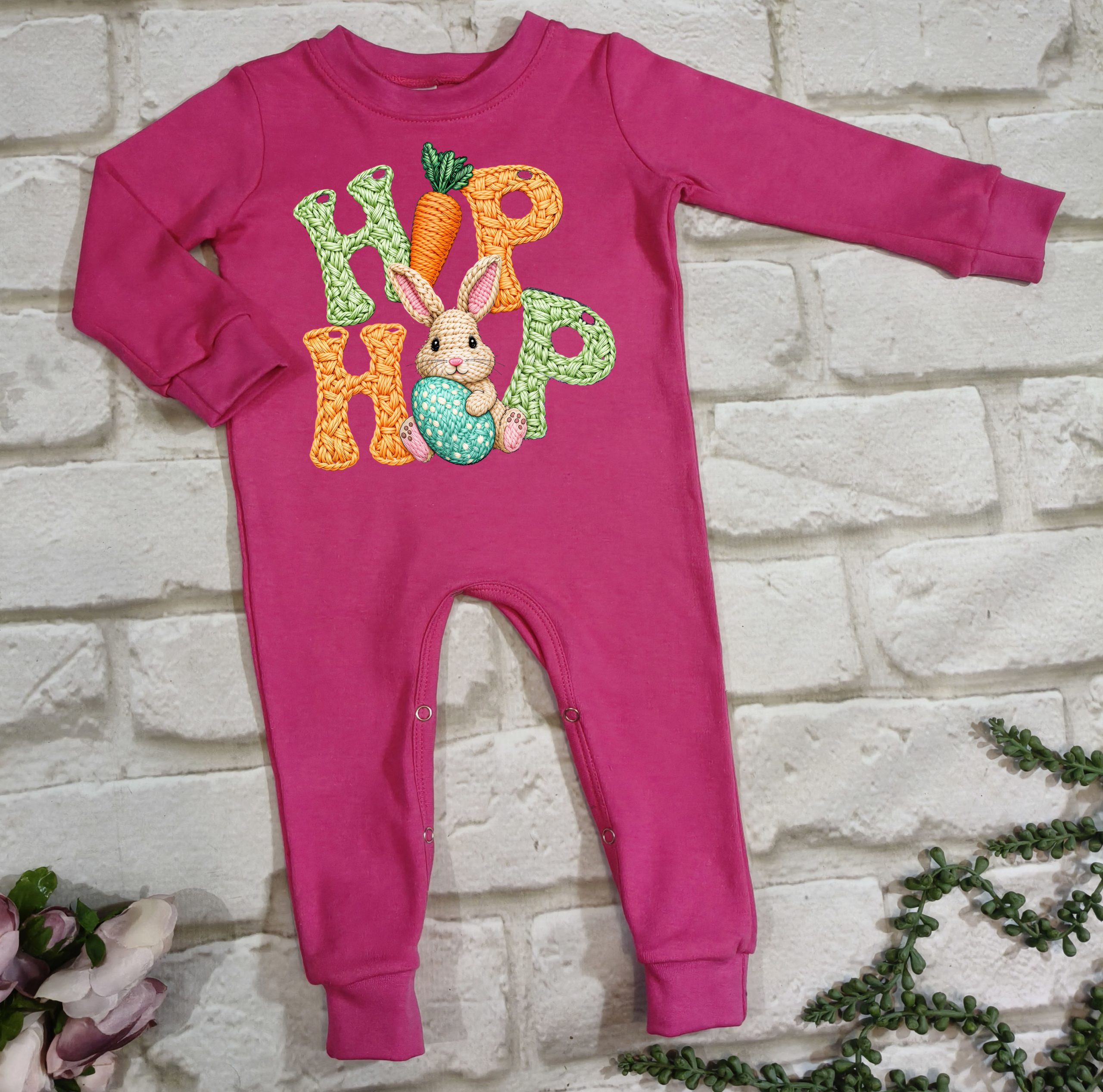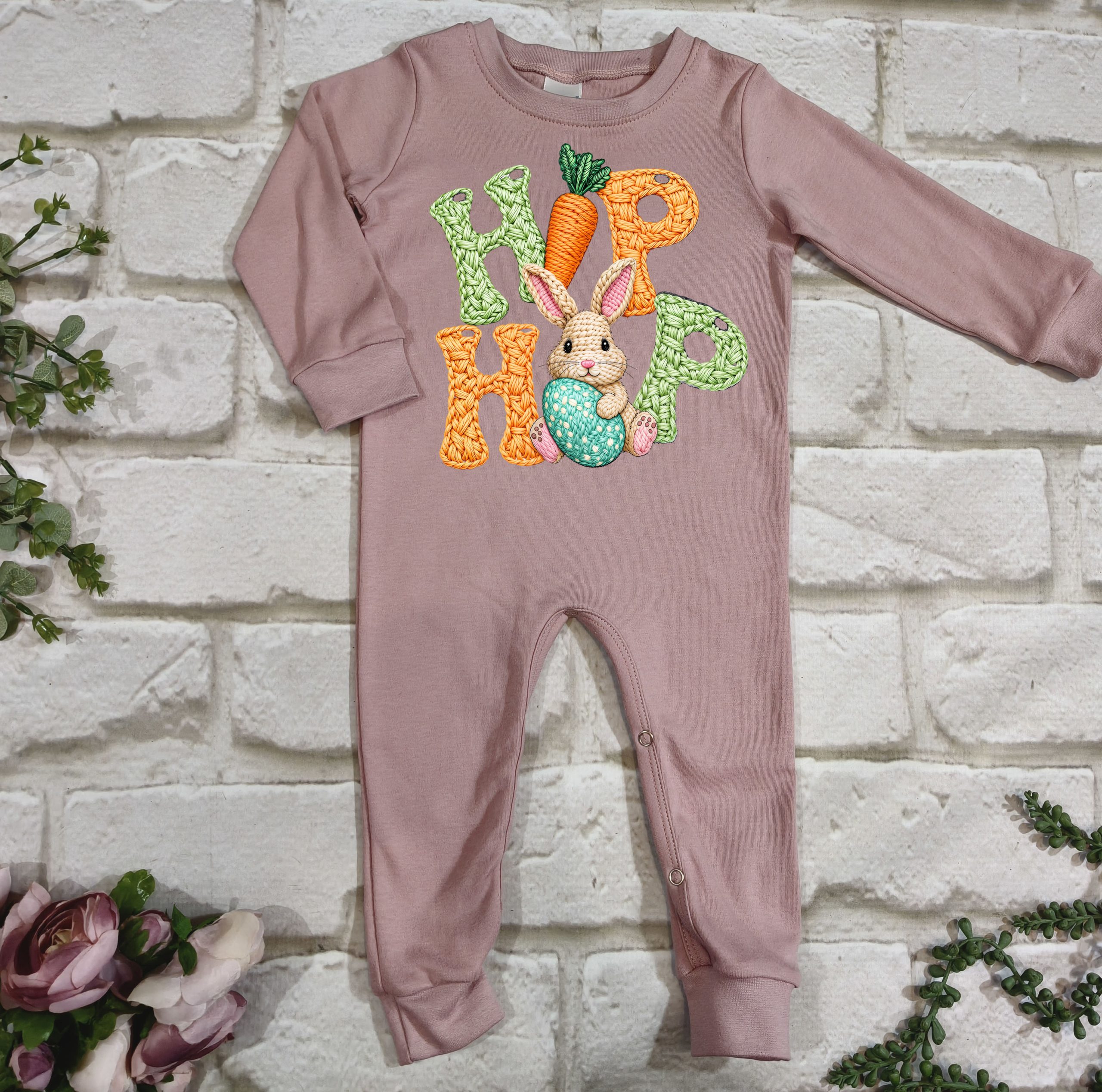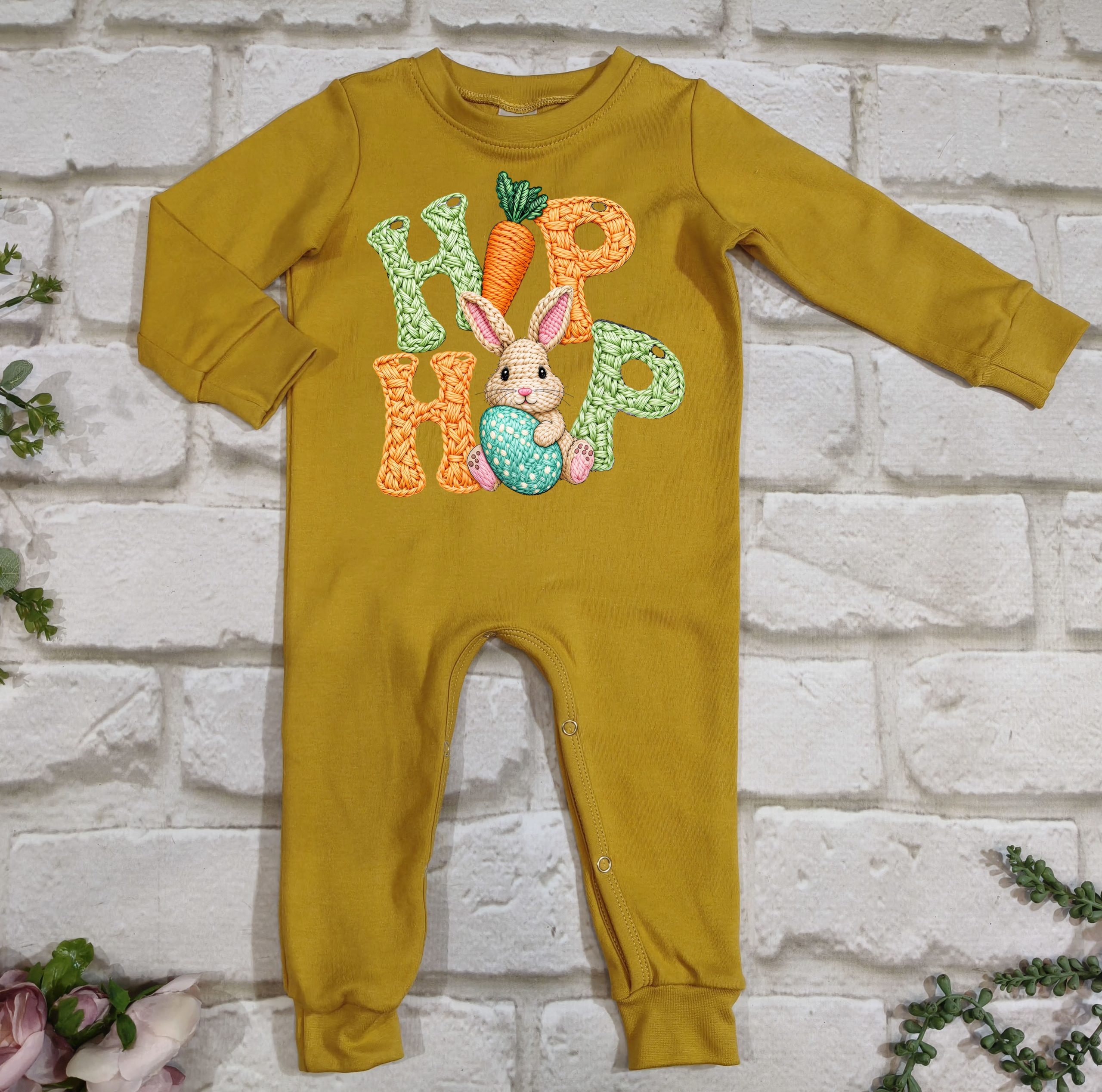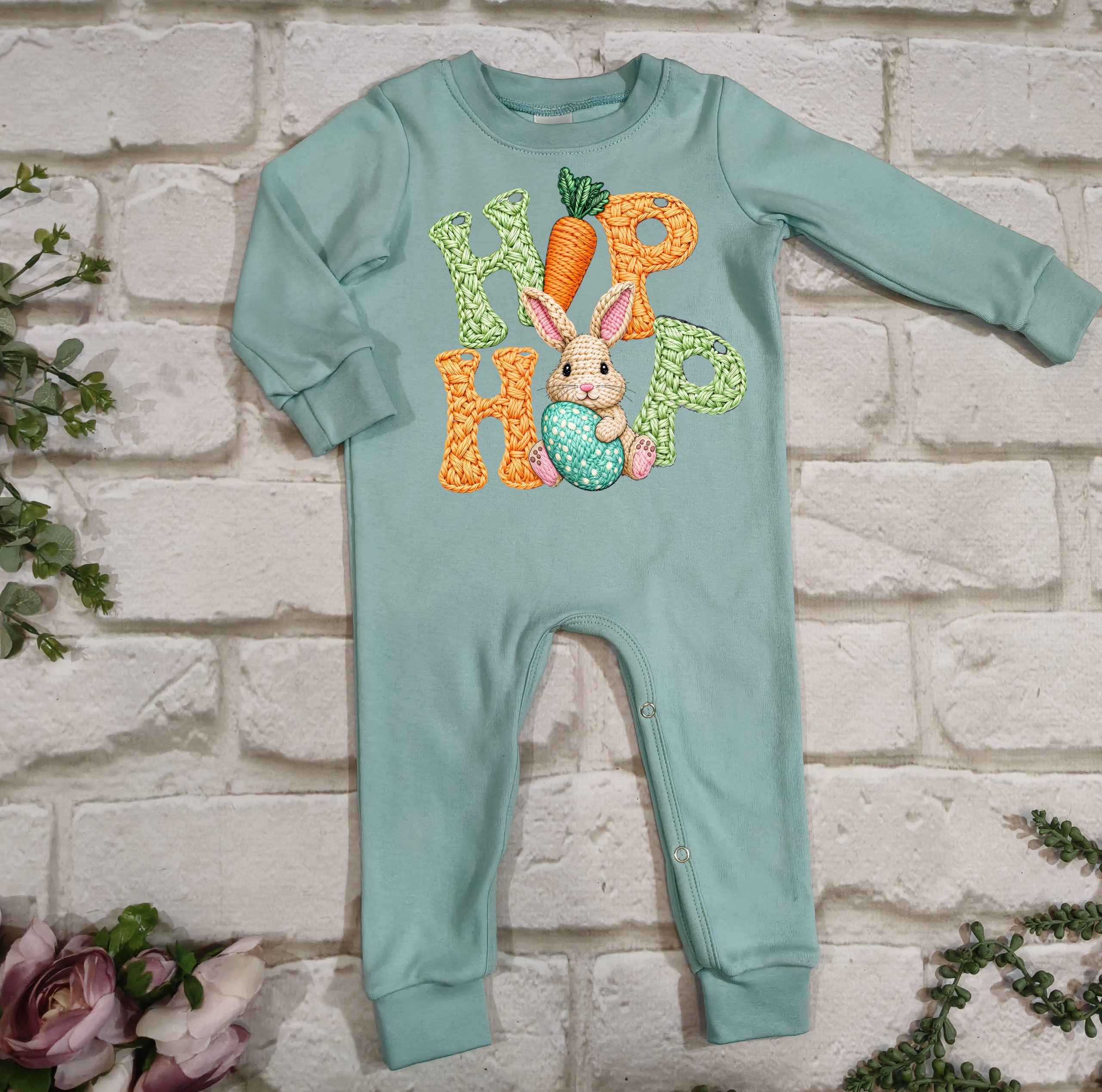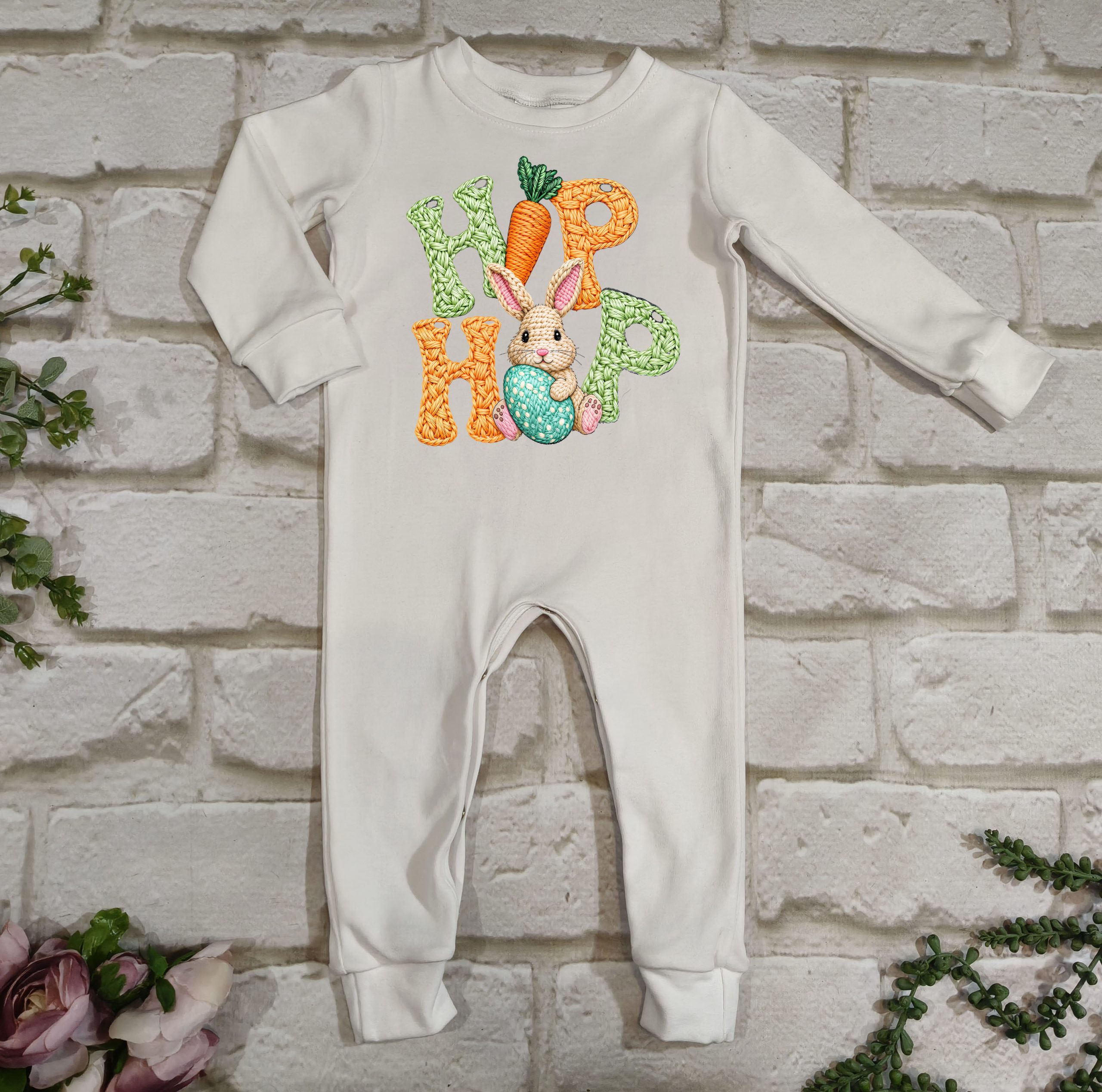 Hierdie oulike Paasfees tema long romper is gemaak van 100% katoen, wat dit sag, asemhaalbaar en gemaklik maak vir jou baba se sensitiewe vel.